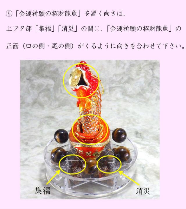 5.『金運祈願の招財龍魚』を置く向きは、上フタ部「集福」「消災」の間に、『金運祈願の招財龍魚』の正面(口の側・尾の側)がくるように向きを合わせて下さい。