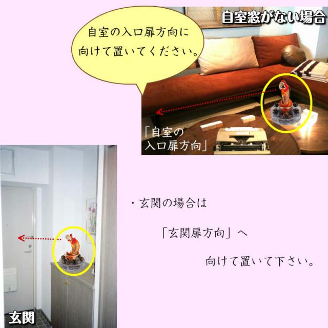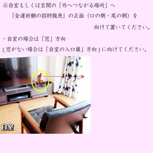 6.自室もしくは玄関の「外へつながる場所」(自室の場合は「窓」もしくは「入口扉」方向、玄関の場合は「玄関扉方向」へ『金運祈願の招財龍魚』の正面(口の側・尾の側)を向けて置いて下さい。
