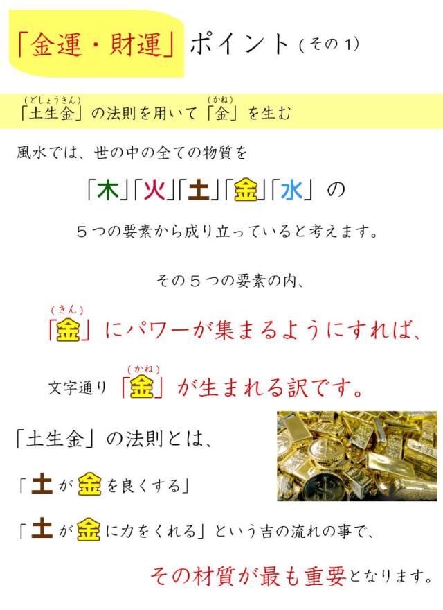 「土生金」の法則とは、「土が金を良くする」「土が金に力をくれる」という吉の流れの事で、その材質が最も重要となります。