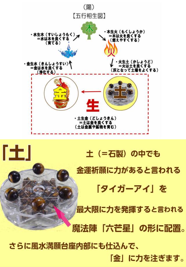 ・「土」—土(=石製)の中でも金運祈願に力があると言われる『タイガーアイ』を、最大限に力を発揮すると言われる魔法陣「六芒星」の形に配置、さらに風水満願台座内部にも仕込んで、「金」に力を注ぎます。