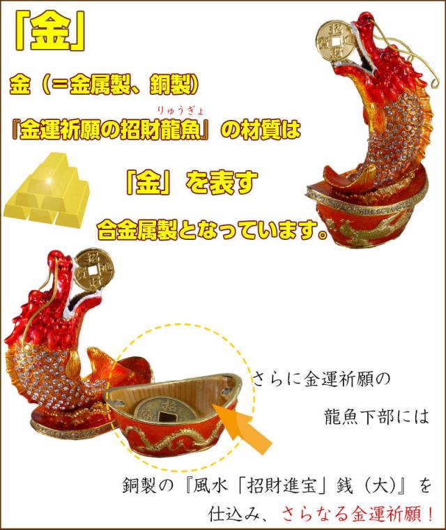 ・「金」—金(=金属製、銅製)『金運祈願の招財龍魚』の材質は「金」を表す合金属性となっています。