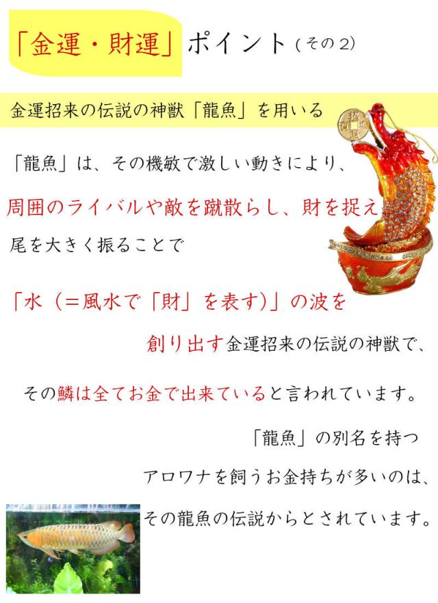 金運招来の伝説の神獣「龍魚」を用いる「龍魚」は、その機敏で激しい動きにより、周囲のライバルや敵を蹴散らし、財を捉え、尾を大きく振ることで「水(=風水で「財」を表す)」の波を創り出す金運招来の伝説の神獣で、その鱗は全てお金で出来ていると言われています。