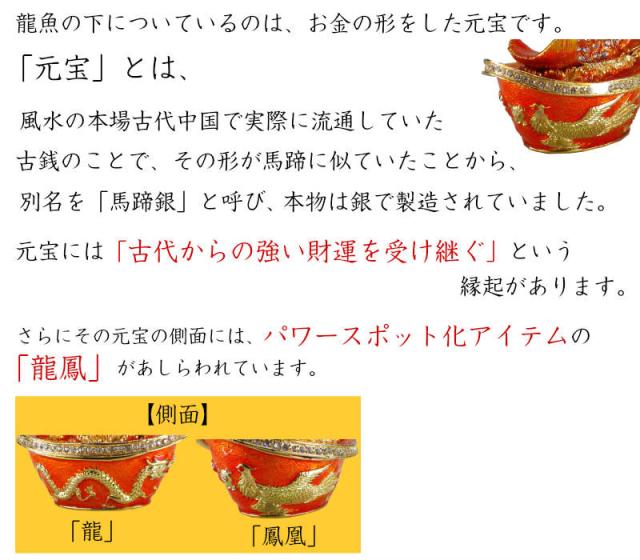 本商品『金運祈願の招財龍魚』は、その口に「招財進宝(=財を招いて宝が増える)」の風水古銭をくわえ、かつ尾の下部の「元宝」型の入れ物から財の波を起こして飛び出してくる形となっています。