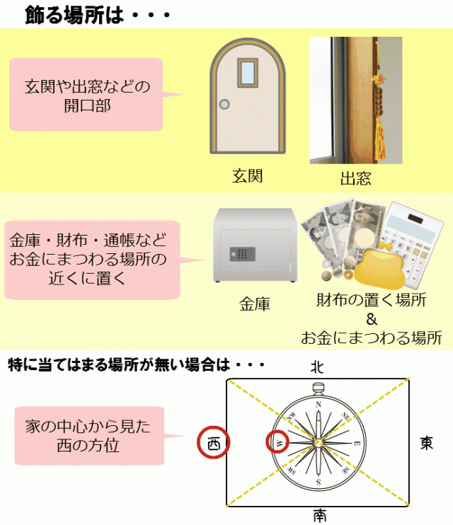 ・一般家庭の場合は玄関や出窓などの開口部の側か、金庫や財布を置く場所などのお金にまつわる場所の近くに掛けるのがオススメ♪