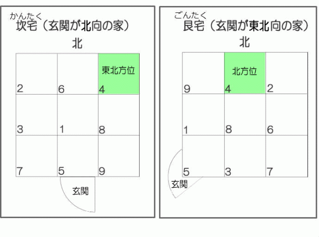 ・玄関が北向き(=(普通は)南に玄関が在る) — 文昌位は(家の中心から見た)「東北」