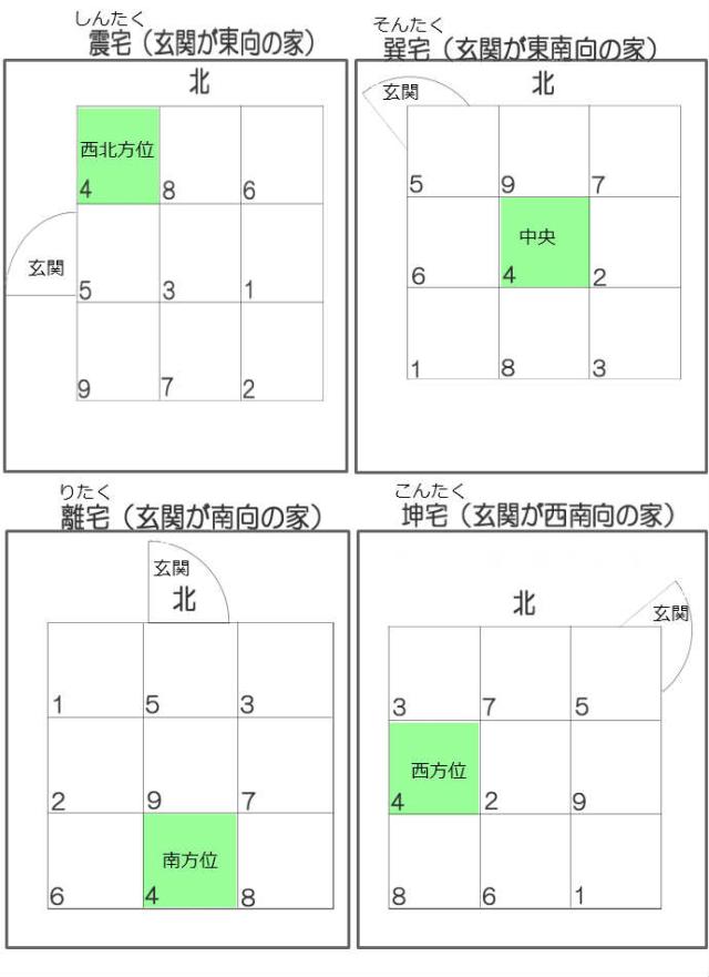 ※一部の書物やウェブサイトにも誤っているものが多いのですが、「(家の中心からみた)どの方位に玄関が在るか?」ではなく、「(外側から玄関を入る際に)どの方位に玄関が向いているか?」で判断しますのでご注意下さい。