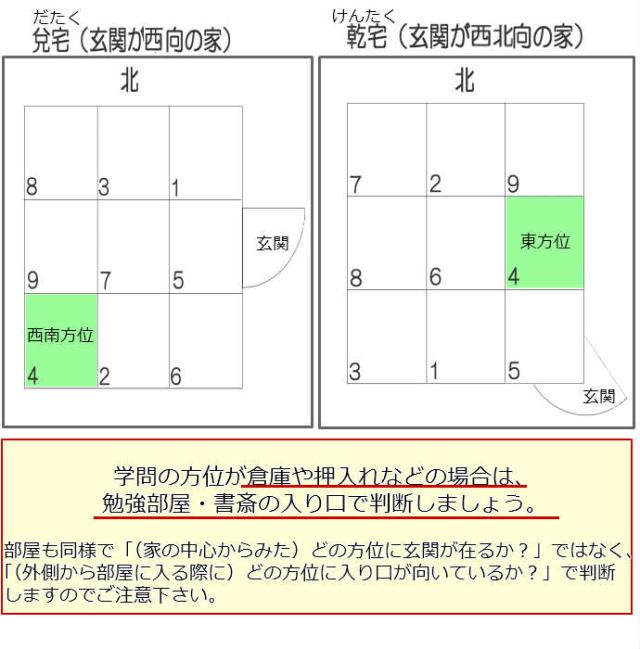 ・玄関が西向き(=(普通は)東に玄関が在る) — 文昌位は(家の中心から見た)「西南」
