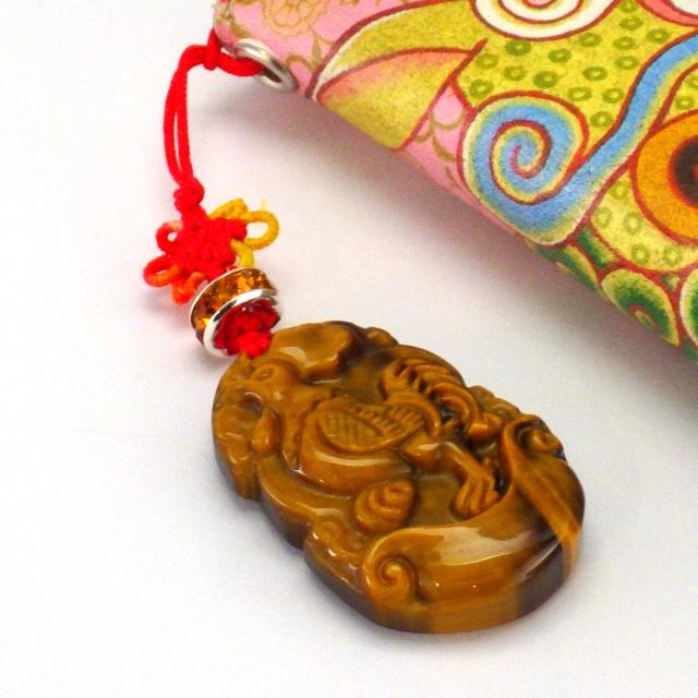 高品質なタイガーアイに、金運祈願アップの元宝の上に乗った干支の酉(とり)が彫刻されたストラップを身に着けて、開運祈願のお守りになさってください。