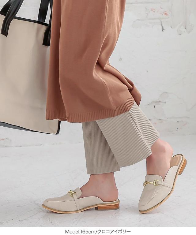 バブーシュタイプのローファーシューズ。ビット付きで大人っぽく、ラフ過ぎない印象に。フラットヒールとクッションの効いたインソールで、歩きやすさも◎。