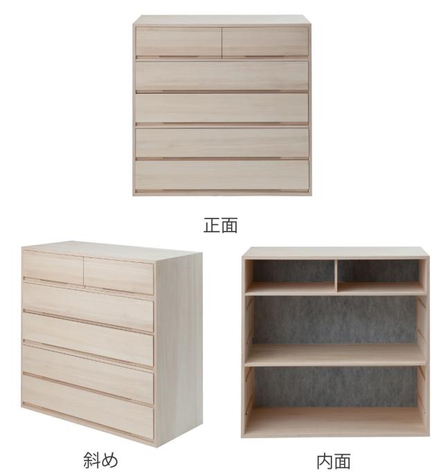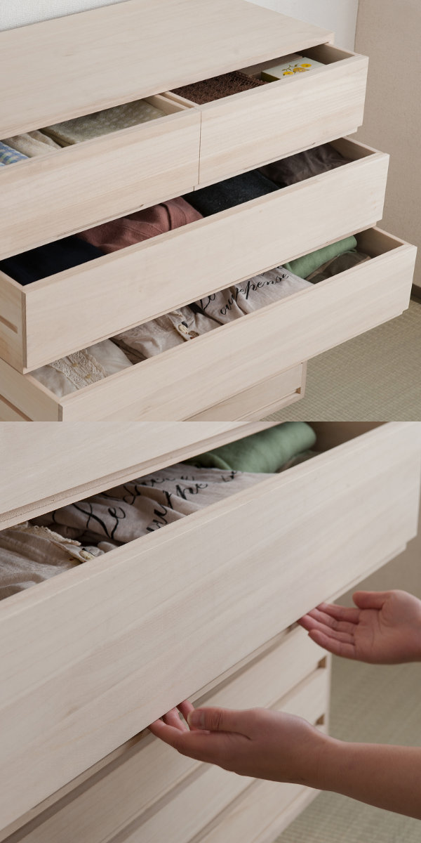 小引出しは下着や靴下などの小物の収納、下段の引出しは衣類の収納に便利です。着物もたとう紙のまま収納できるサイズです。