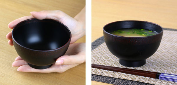 お椀の縁のみ布目塗りという手法で塗られおり、少しザラっとした質感。布目の風合いを楽しめます。