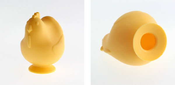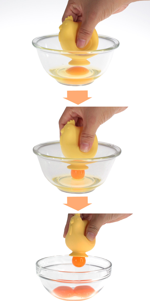 にわとりの両側を押して空気を抜き、卵の表面に吸引口を当て力を緩めるだけ。簡単に黄身を吸い取ることができます。あとは、別の容器に押し出すだけです。手を汚さず、黄身と白身を分けることができる便利グッズです。