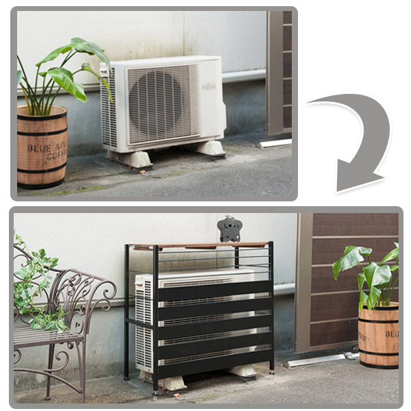 玄関前やベランダなど、室外機が設置されている場所におくだけで見た目もよくなり、さらにちょっとした物置きスペースになります。