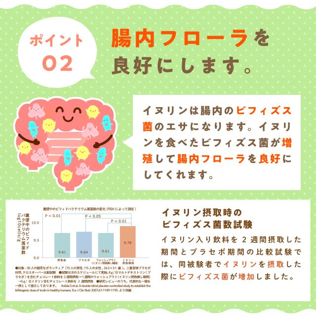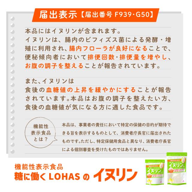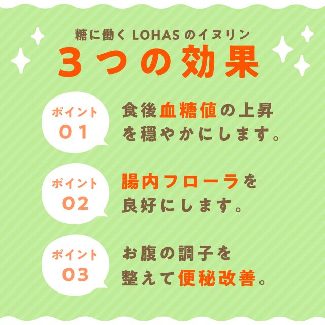 届出表示【届出番号 F939】本品にはイヌリンが含まれます。 イヌリンは、腸内のビフィズス菌による発酵・増殖に利用され、腸内フローラが良好になることで、便秘傾向者において排便回数・排便量を増やし、おなかの調子を整えることが報告されています。 また、イヌリンは食後の血糖値の上昇を緩やかにすることが報告されています。 本品はおなかの調子を整えたい方、食後の血統リが気になる方に適した食品です。