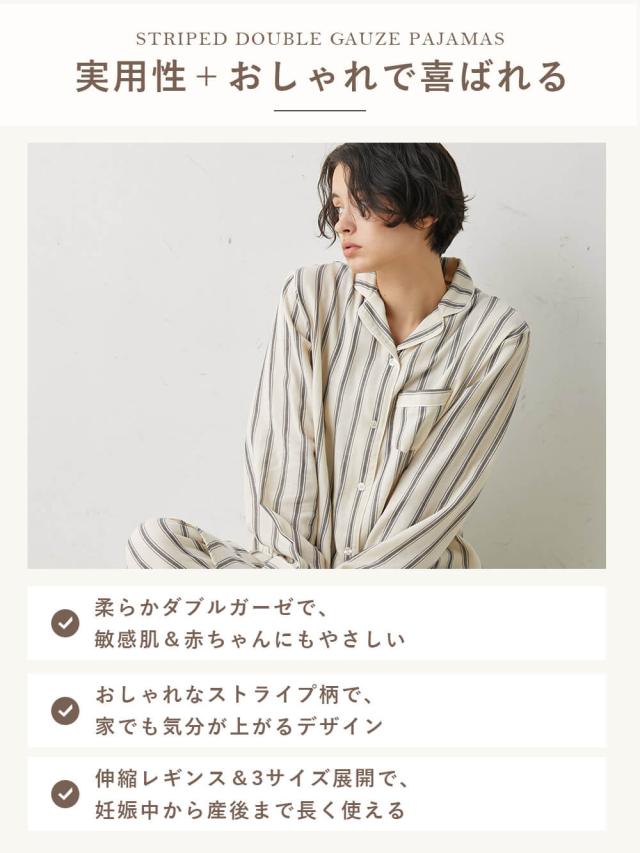 【授乳しやすい】【産前産後対応パンツ付】ストライプダブルガーゼパジャマ&産前産後レギンス