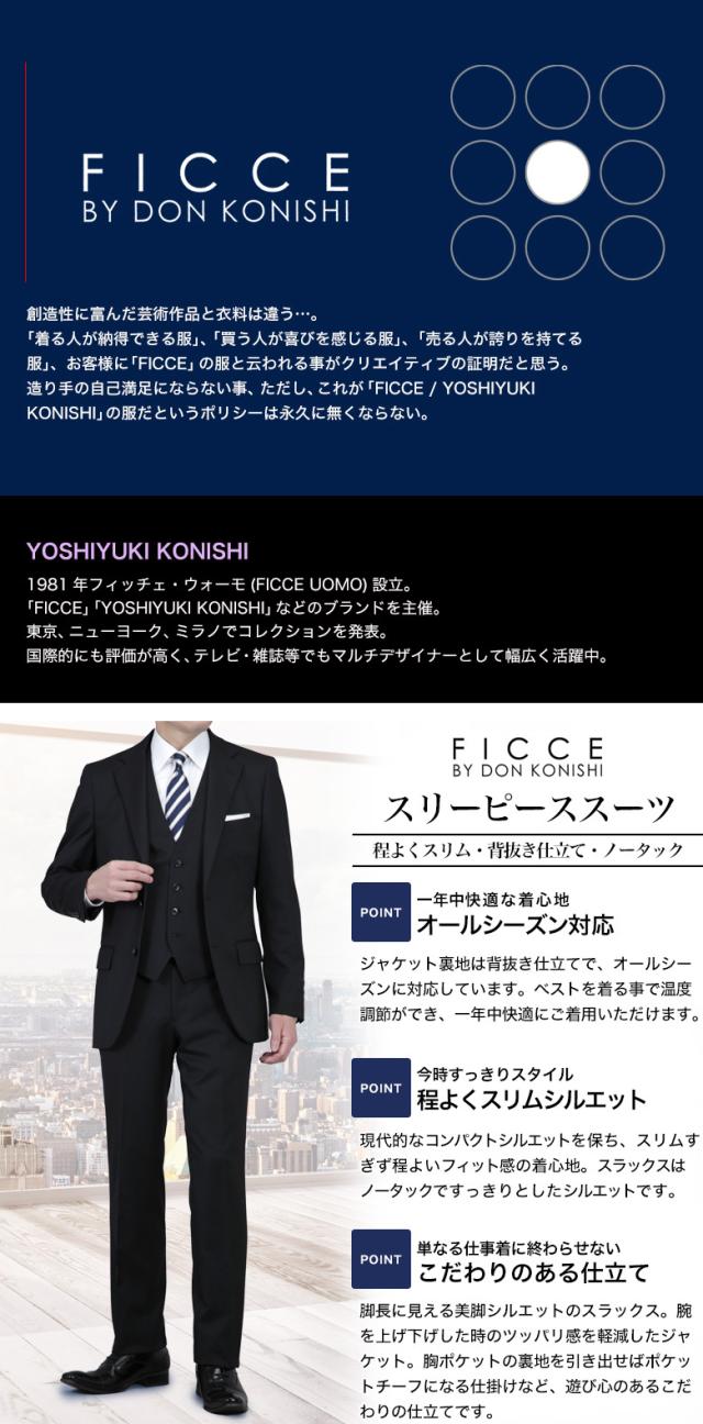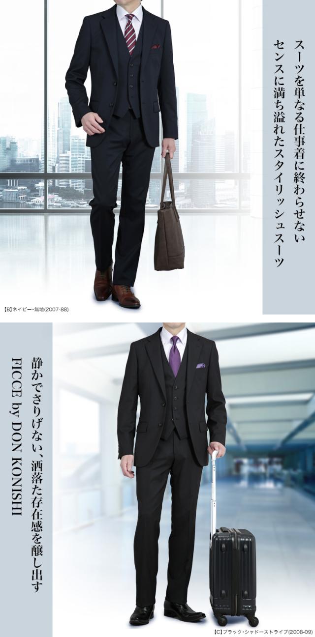 洗練された美脚ライン、着る人をスタイルアップする“FICCE by DON KONISHI”スーツは、スーツを単なる仕事着に終わらせない、センスに満ち溢れたシリーズ。 ベストが加わることでシャツの露出部分が狭くなり、一気にフォーマルな印象になります。 顧客から信頼感を印象付けたい、そんな方にはスリーピーススーツが特効アイテム。 華やかさだけに収まらない、大人の深みを醸し出します。ビジネスで求められる節度や信頼感を踏まえつつ、スタイリングに彩りと色気を加え、スーツ姿ってこんなに格好いいのかと再認識できるお洒落さが特徴です。 静かでさりげない、洒落た存在感を醸し出すスリムスーツです。
