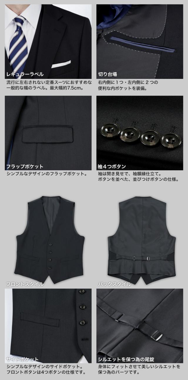 | ▼ジャケット ・2ツボタン ・ナローラペル ・袖4ツボタン ・センターベント ・背抜き仕立て ・両脇フラップポケット ・裏地ピンポイントステッチ ・玉縁ポケット ・D管留め ・脇下アクションプリーツ ・胸ポケット裏地、ポケットチーフ仕様 ▼ベスト(ジレ) ・4ツボタン ・襟無し ・ウエスト調節可能な尾錠付き ▼スラックス ・ノータック ・程よいテーパード ・ローライズ(+3cm) ・膝裏付・股シック付 ・シャツすべり止め ・ピスポケット(左ボタン) ※後ろ右ポケットはボタンがついていません。 |