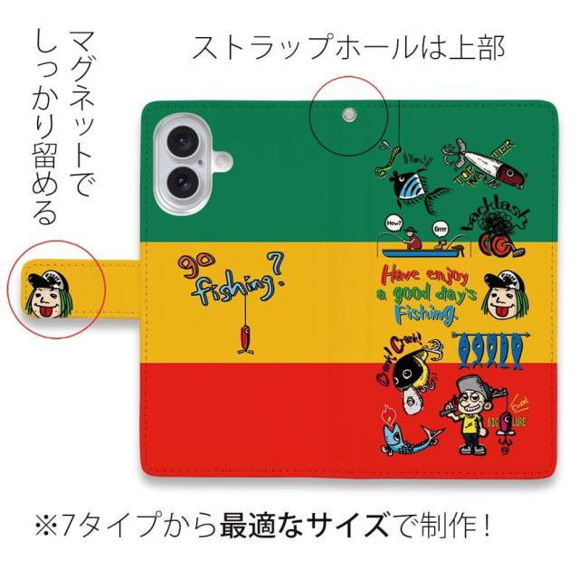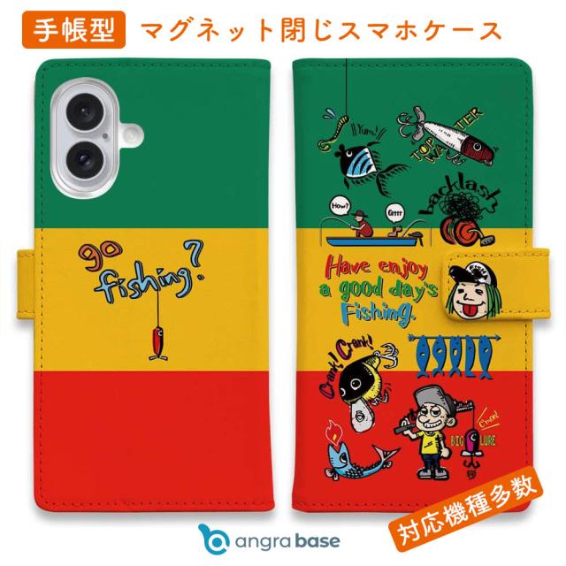スマホケース 手帳型 カード収納 マグネット iPhone17 Pro Max iPhone Air iPhone16e iPhone16 Pro Max 16 Plus 15 Pro Max Xperia 10 VII Galaxy AQUOS ARROWS Pixel10 XL 釣り 魚 ルアー 釣りざんまい 魚釣りに出かけよう!_カラフルラスタカラー