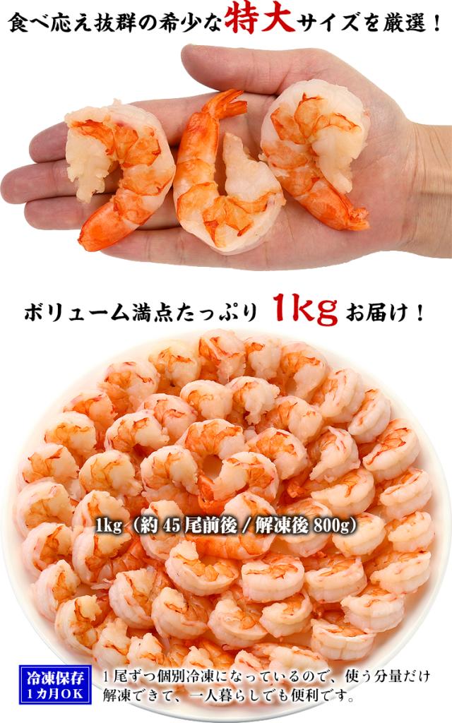 商品内容:むきえび(ブラックタイガー)1kg(約45尾前後/解凍後800g)