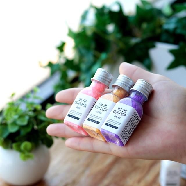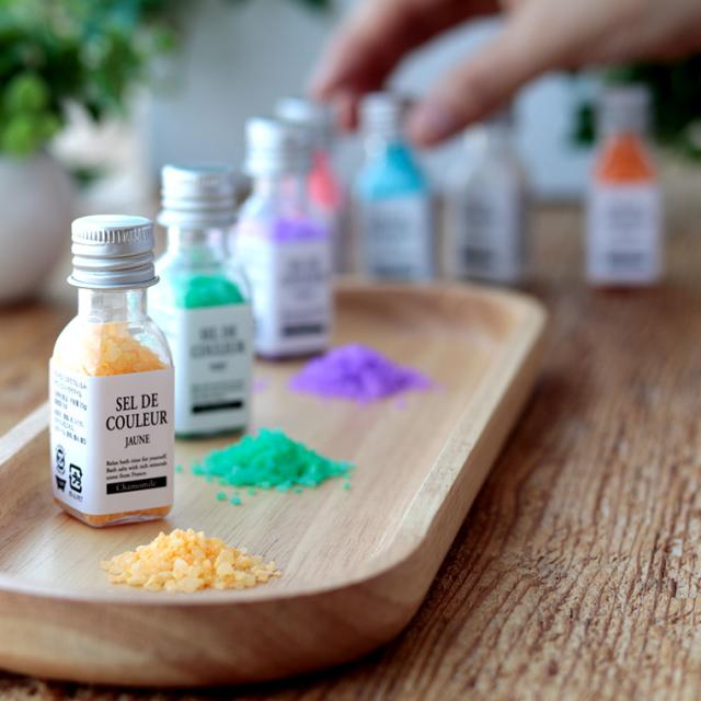 ブルターニュの自然塩に天然エッセンシャルオイルや植物保湿成分配合のカラフルなバスソルト。