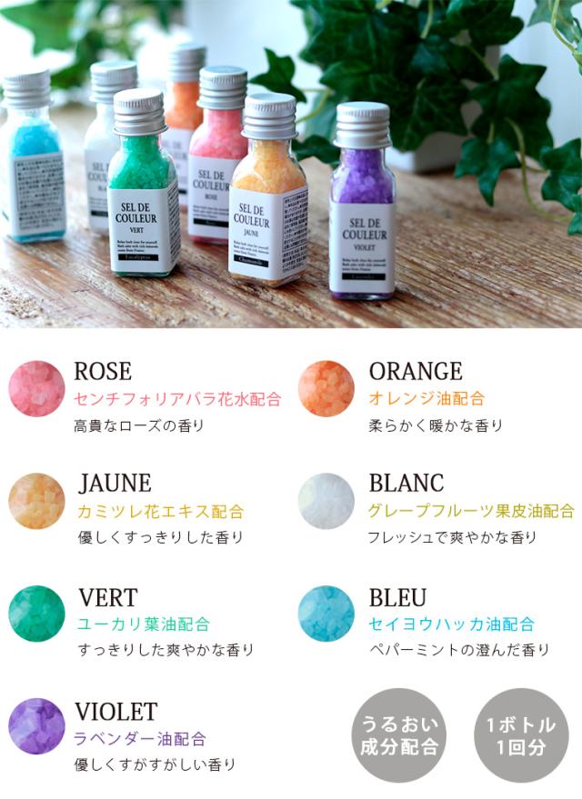 | ブルターニュの自然塩に天然エッセンシャルオイルや植物保湿成分配合のカラフルなバスソルト。 それぞれ異なったエキスやオイルのうるおい成分を配合。 優しい香りと色とりどりの湯色が、疲れたカラダとココロを満たしてくれます。 七色のボトルにフランス語のロゴがおしゃれ。飾っておくだけでバスルームを明るくしてくれます。 ROSE:センチフォリアバラ花水を配合。ローズの高貴な奥深い香りが楽しめます。 ORANGE:オレンジ油を配合。オレンジの柔らかく暖かな香りが楽しめます。 JAUNE:カミツレ花エキスを配合。カモマイルの優しくすっきりした香りが楽しめます。 BLANC:グレープフルーツ果皮油を配合。フレッシュで爽やかな香りが楽しめます。 VERT:ユーカリ葉油を配合。ユーカリのスッキリした爽やかな香りが楽しめます。 BLEU:セイヨウハッカ油を配合。ペパーミントの澄んだ新鮮な香りが楽しめます。 VIOLET:ラベンダー油を配合。ラベンダーの優しくすがすがしい香りが楽しめます。 |