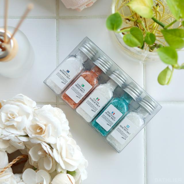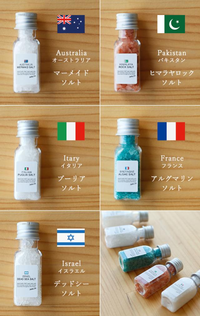 5ヶ国の塩の入浴剤。世界の国々から集めたバスソルトを小さなボトルに詰め込んだセット。