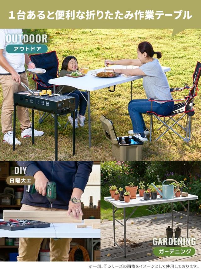 DIYや園芸作業はもちろん、キャンプやバーベキューなどのアウトドアシーン、室内での作業台としても活躍する折りたたみ式作業テーブル。