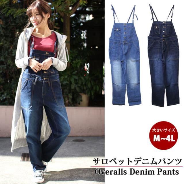 秋新作 大きいサイズ レディース ゆるサロペットデニムパンツ レディース オーバーオール ロング丈 無地 大きいサイズ M L LL 3L 4L ブルー ネイビー