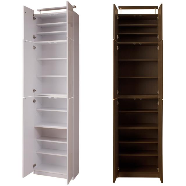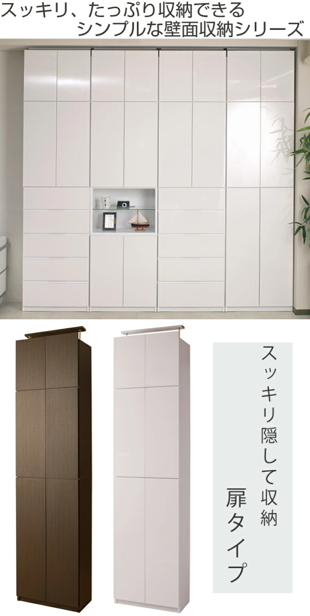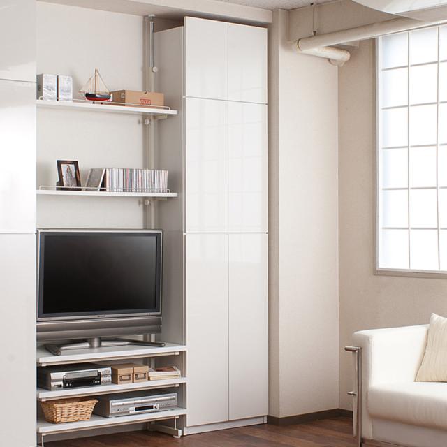 突っ張り 壁面収納 扉タイプ キャビネット 幅60cm 耐震 日本製 ( 壁面家具 つっぱり 転倒防止 ハイグロス 大量収納 簡単設置 半完成品 F★★★★ 全面扉 本棚 突っ張り家具 高さ230〜253cm 可動棚 巾木除け 艶出し 木目調 )