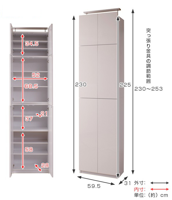 | サイズ | 約 幅59.5×奥行31×高さ230(cm) ※高さは立ち上がり扉高5cm含む 突っ張り高さ調節範囲:約230〜253cm 扉内内寸:約52×奥行28×高さ(上)34.5(中)68.5(下)固定棚〜上37・固定棚〜下58cm |