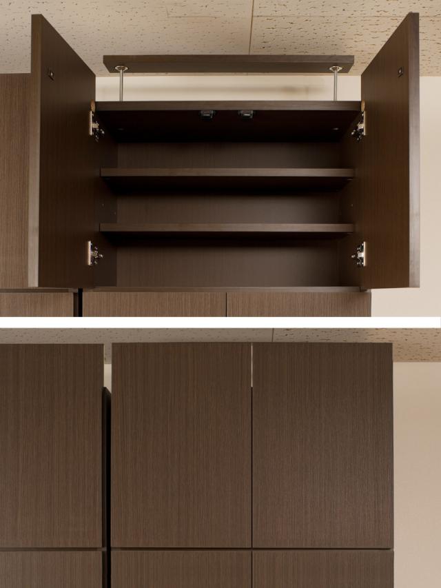 上段の扉収納内は、全て可動棚です。棚板を調節すればA4サイズが入るので、本や書類もまとめて収納できます。