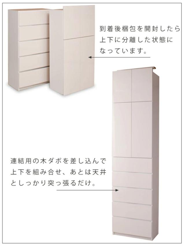 梱包を開封したら、上下を連結して突っ張るだけで簡単に設置完了です。時間がかからないように、ほとんど完成した状態でお届けします。