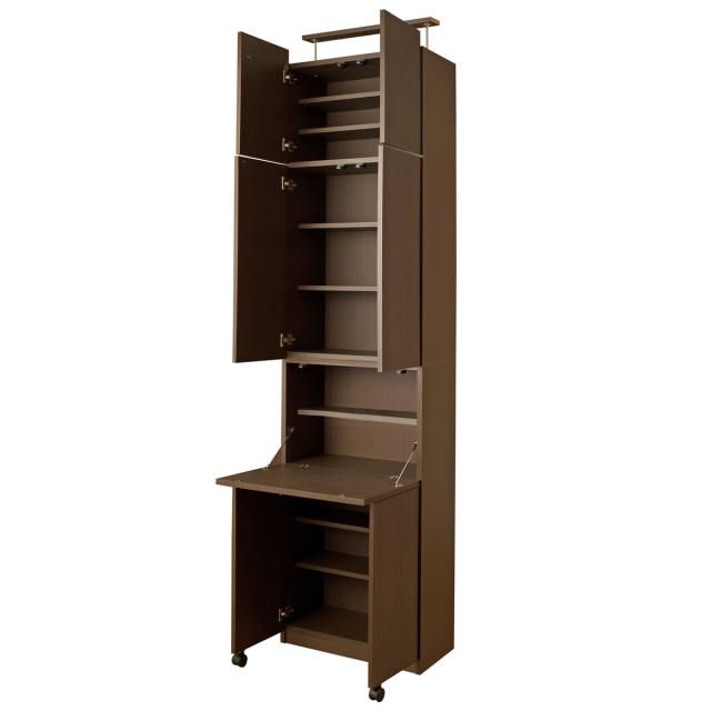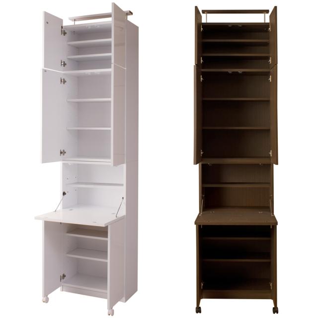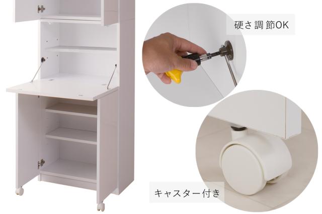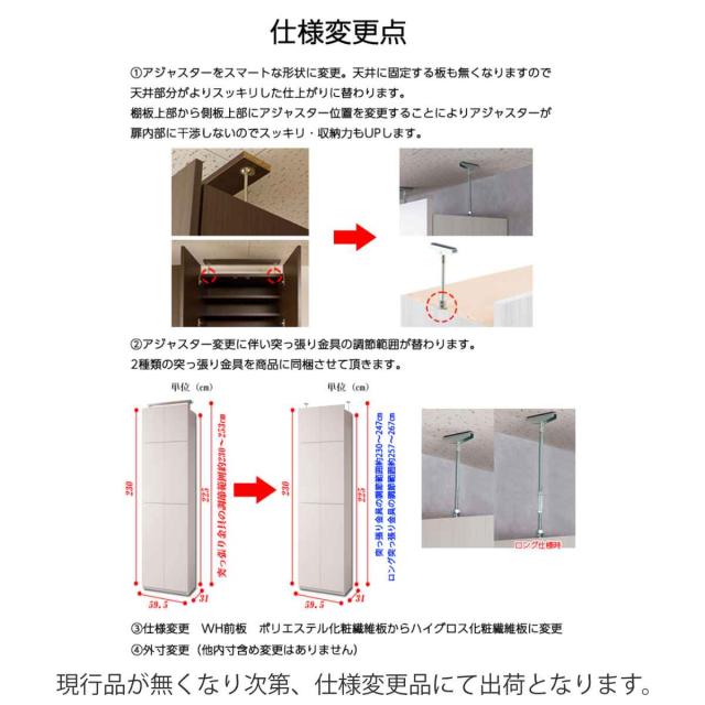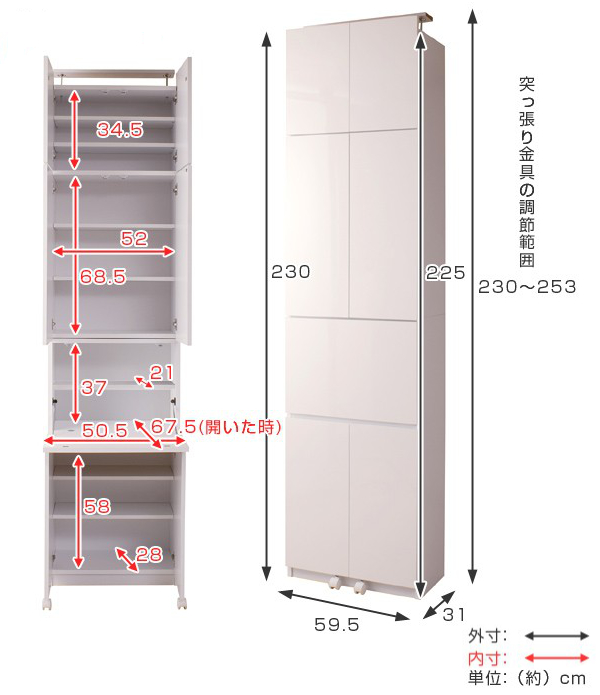 | サイズ | 約 幅59.5×奥行31×高さ230(cm) ※高さは立ち上がり扉高5cm含む 突っ張り高さ調節範囲:約230〜253cm 扉内内寸:約52×奥行28×高さ(上)34.5(中)68.5(下)58 デスク部内寸:約50.5×奥行28×高さ37cm |