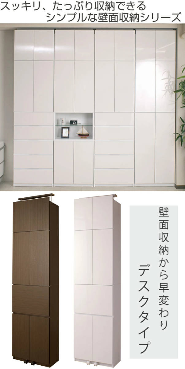突っ張り 壁面収納 デスクタイプ キャビネット 幅60cm 耐震 日本製 ( 壁面家具 つっぱり 転倒防止 ハイグロス 大量収納 簡単設置 半完成品 F★★★★ デスク 本棚 突っ張り家具 高さ230〜253cm 可動棚 巾木除け 艶出し 木目調 )