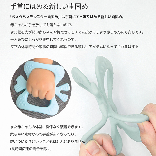 「ちょうちょモンスター歯固め」は手首にすっぽりはめることができる新しい歯固め。