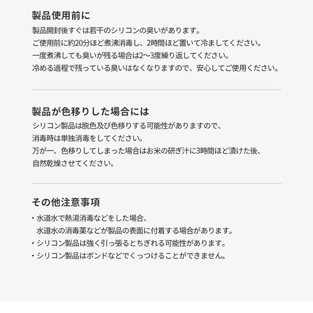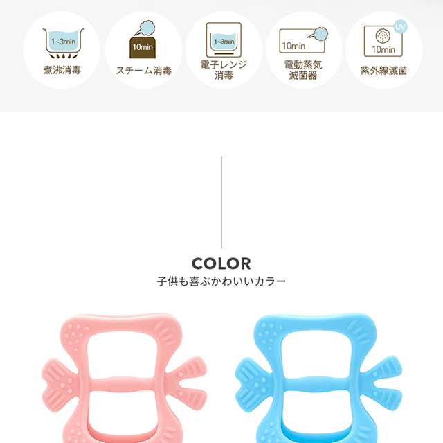 熱湯・煮沸消毒、電子レンジ、スチーム消毒、液体消毒など一般的に行われるすべての消毒・殺菌方法が使用可能です。