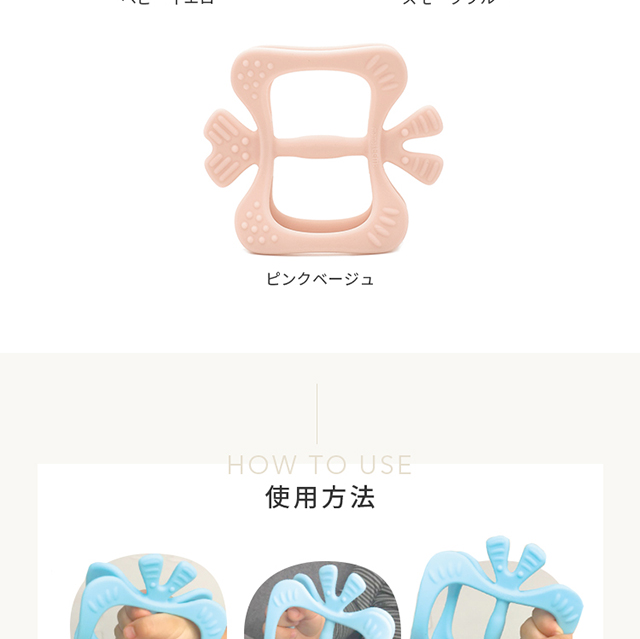 赤ちゃんが手を放しても落ちないので、歯固めやおもちゃに慣れていなかったり、持たせてもすぐに投げてしまう赤ちゃんにも安心です。