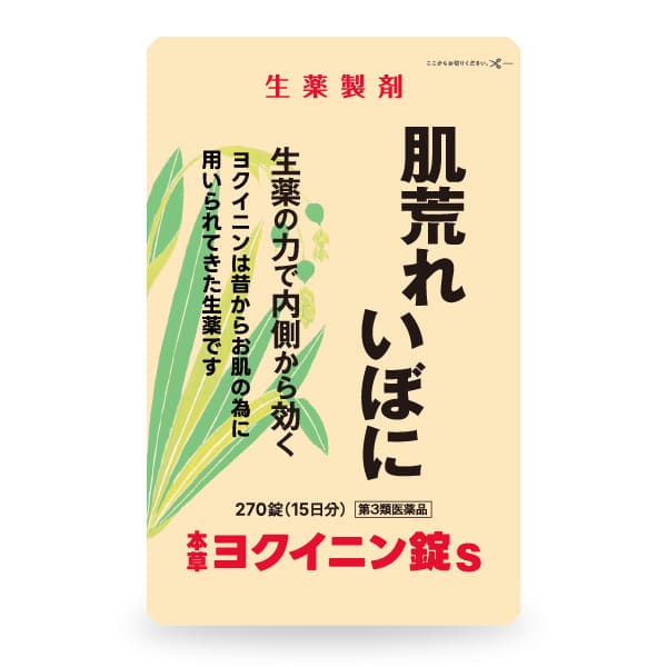 商品説明:いぼ・皮膚のあれなどに効果のある皮膚の薬です。効能・効果:いぼ・皮膚のあれ用法・用量:次の量を1日3回食間又は食前に水又は温湯にて服用すること。 [年齢:1回量:1日服用回数] 大人(15歳以上):6錠:3回11歳以上15歳未満:4錠:3回8歳以上11歳未満:3錠:3回5歳以上8歳未満:2錠:3回5歳未満:服用しないこと<用法・用量に関連する注意>小児に服用させる場合には、 保護者の指導監督のもとに服用させること。成分・分量:1日量18錠(大人の1日服用量)中、次の成分を含有する。成分:日本薬局方ヨクイニン末4,200mg(18錠中)日本製/第3類医薬品広告文責:くすりの勉強堂TEL 0248-94-8718文責:薬剤師 薄葉 俊子