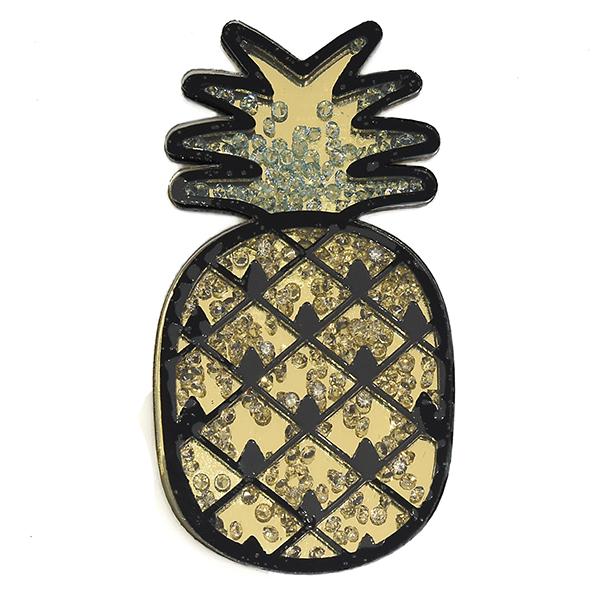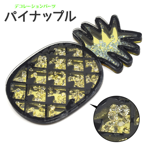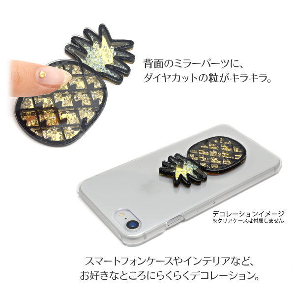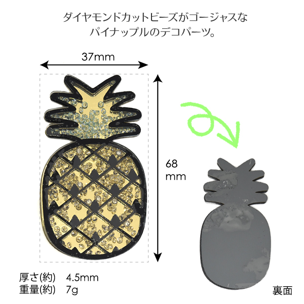 キラキラ輝くパイナップルのデコレーションパーツ。 背面はミラータイプ、ダイヤモンドカットの粒がゆれると更にキラキラ。スマホケースや手帳などをお好きにデコレーションしてくださいね。