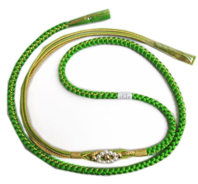 帯締め 帯〆 パール飾り付 先割れ 正絹 黄緑色金 振袖用 成人式 着物 グリーン