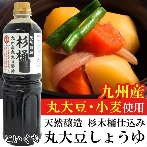 厳選された九州産の丸大豆と小麦を原料として天然蔵の20石杉木桶に仕込み、蔵つきの天然酵母で1年以上じっくりと自然に熟成させました。芳醇で濃厚な旨みを持つ全体的にバランスのとれた丸大豆醤油です。なお、原材料にはアルコールを使用していません。無添加ですので、醤油本来の風味をお楽しみ頂けます。つけ・かけ・煮物、お刺身など、お使いいただけますと料理の味わいをより一層深めます。他の醤油蔵とはまた違った美味しい味わいをご堪能ください。