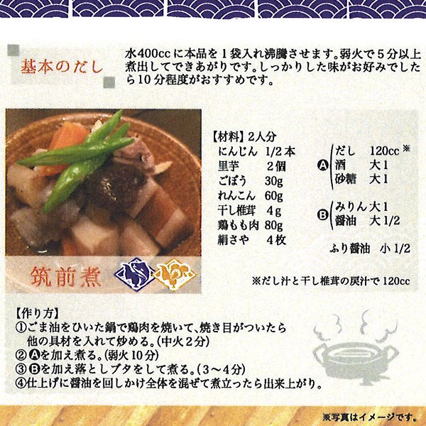 食塩・粉末醤油・調味料(アミノ酸等)・酵母エキスを使用していない天然素材100%の「合わせだし」です。