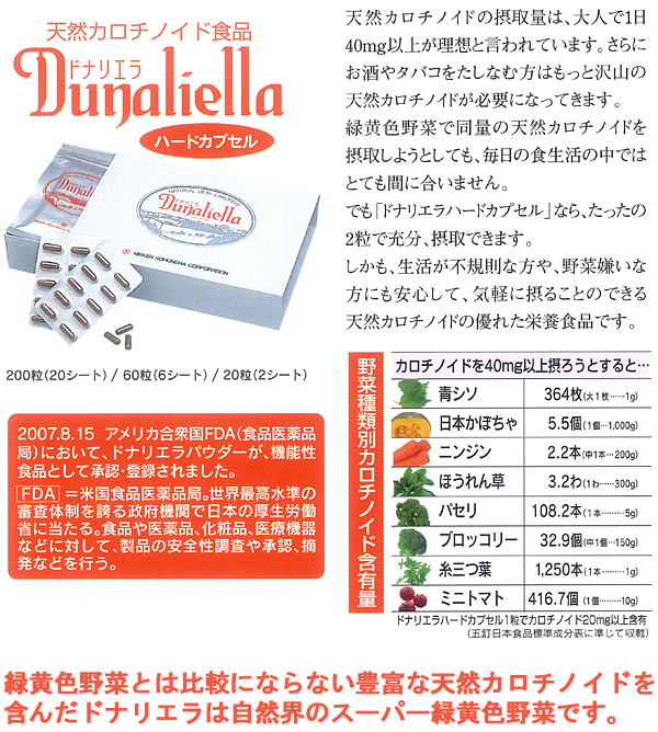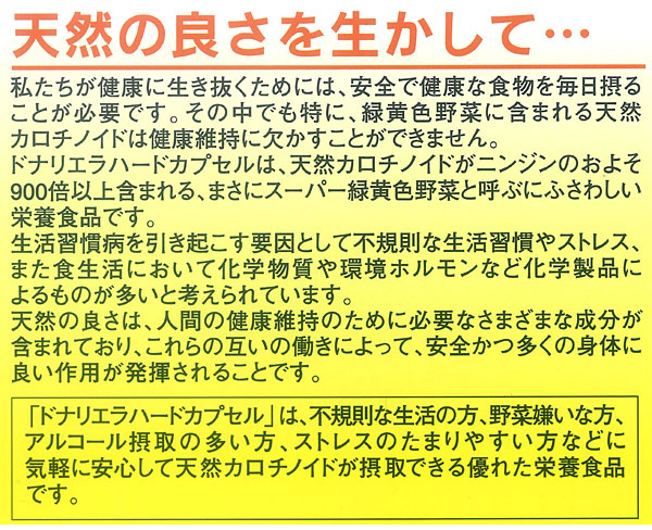 健康維持のために理想的な天然カロチノイド(ベータカロチンなど)の摂取量は、大人で1日40mg以上といわれています。毎日の食生活の中で、緑黄色野菜の摂取だけでは間に合いません。ドナリエラハードカプセルは良質な天然カロチノイドを十分に補いたい方のために開発されたサプリメントです。