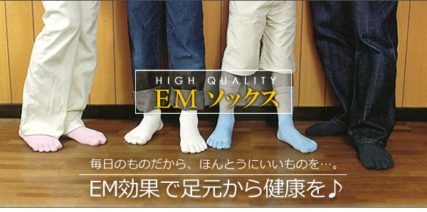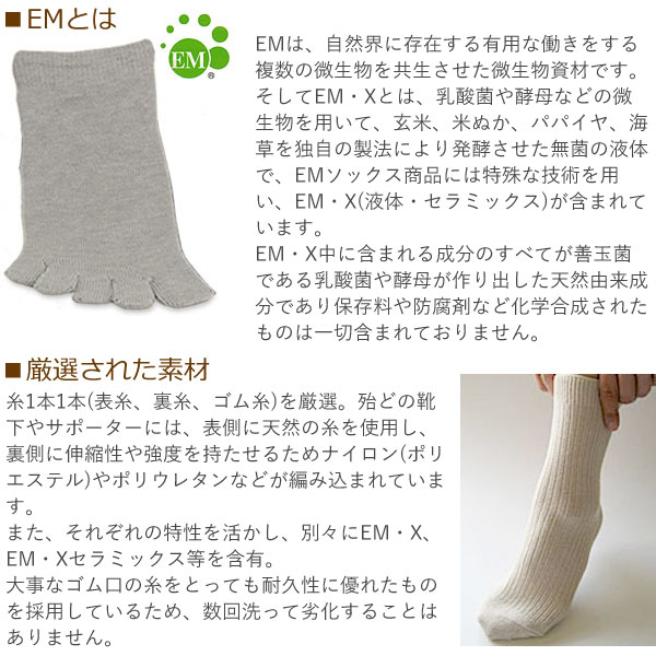 EMヘンプソックスは、足の健康を考えた履き心地の良い靴下です。使用の糸には特殊技術を用い、EM・Xを含有させています。すべて天然物からできたEM・XはEMから生成される抗酸化物質で、人間の活動によって生じた汚染物質を有用な物質に変えることで、環境浄化、食品加工、土木建築、など、様々な分野に広く応用されています。