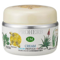 プロハーブEMクリームは、何度も試行錯誤をかさね、時間をかけて。保湿成分に「プロポリス」、天然ハーブを何種類も調合することにより得られる「相乗パワー」を生かした、自然派(今でいうとボタニカル)の保湿クリームとして誕生しました。