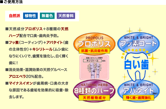 虫歯を防いで息スッキリ、健康的な輝く白い歯にする自然派ゲルはみがきです。