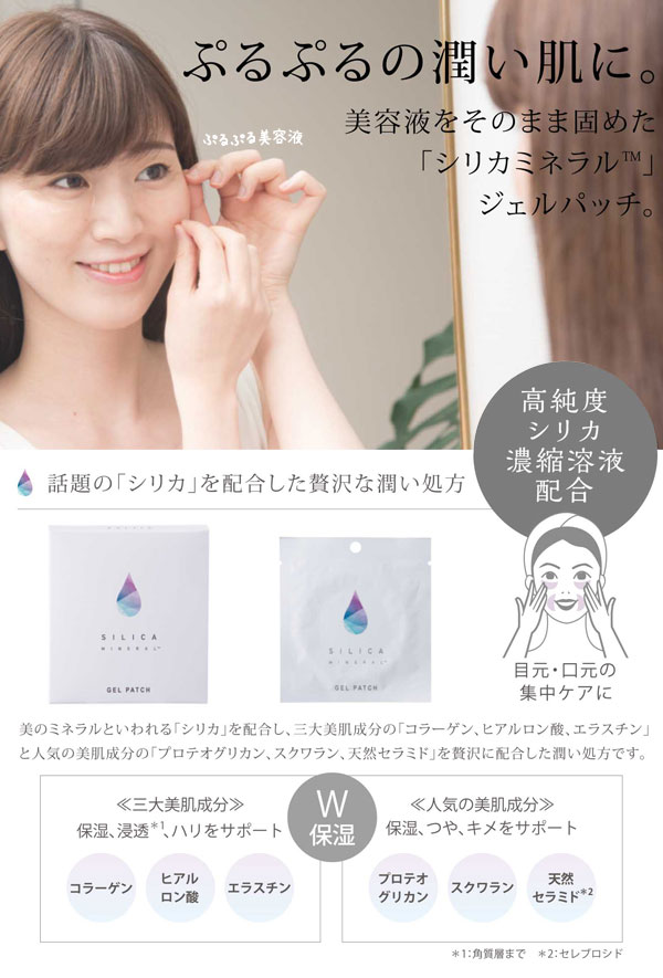 話題の「シリカ」を配合し、三大美肌成分の「コラーゲン、ヒアルロン酸、エラスチン」と人気の美肌成分の「プロテオグリカン、スクワラン、天然セラミド」を贅沢に配合した【W保湿】の潤い処方です。
