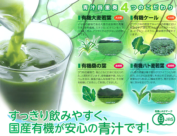 国産有機原料100%。大麦若葉・ケール・桑の葉・はと麦若葉をブレンド