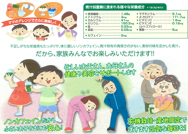 本品は、有機JAS認証を受けた国産原料を使用しています。大麦若葉、ケール、桑の葉、ハト麦若葉たちが奏でるおいしいハーモニーをお楽しみください。
