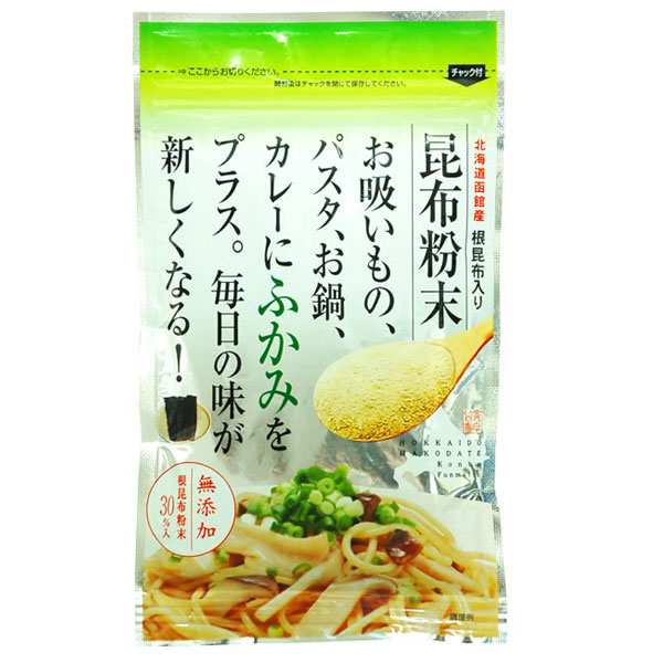 函館市白口浜(旧南茅部町)の真昆布は肉厚で旨み成分が強く素材の味を活かす美味しいだしがとれます。その真昆布の根昆布を30%、真昆布を70%配合し、旨みと風味が強い原料を吟味し、粉末にしました。
